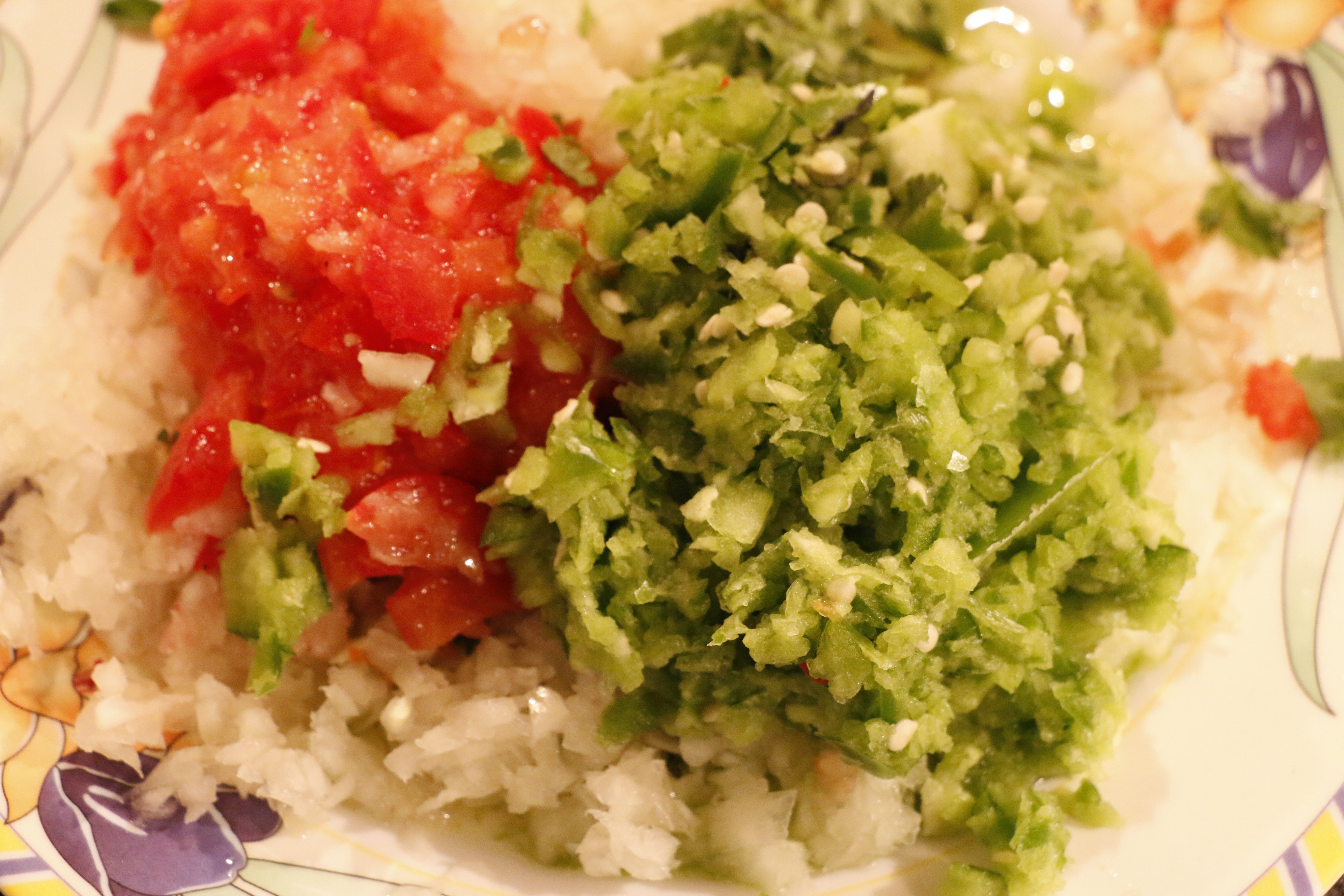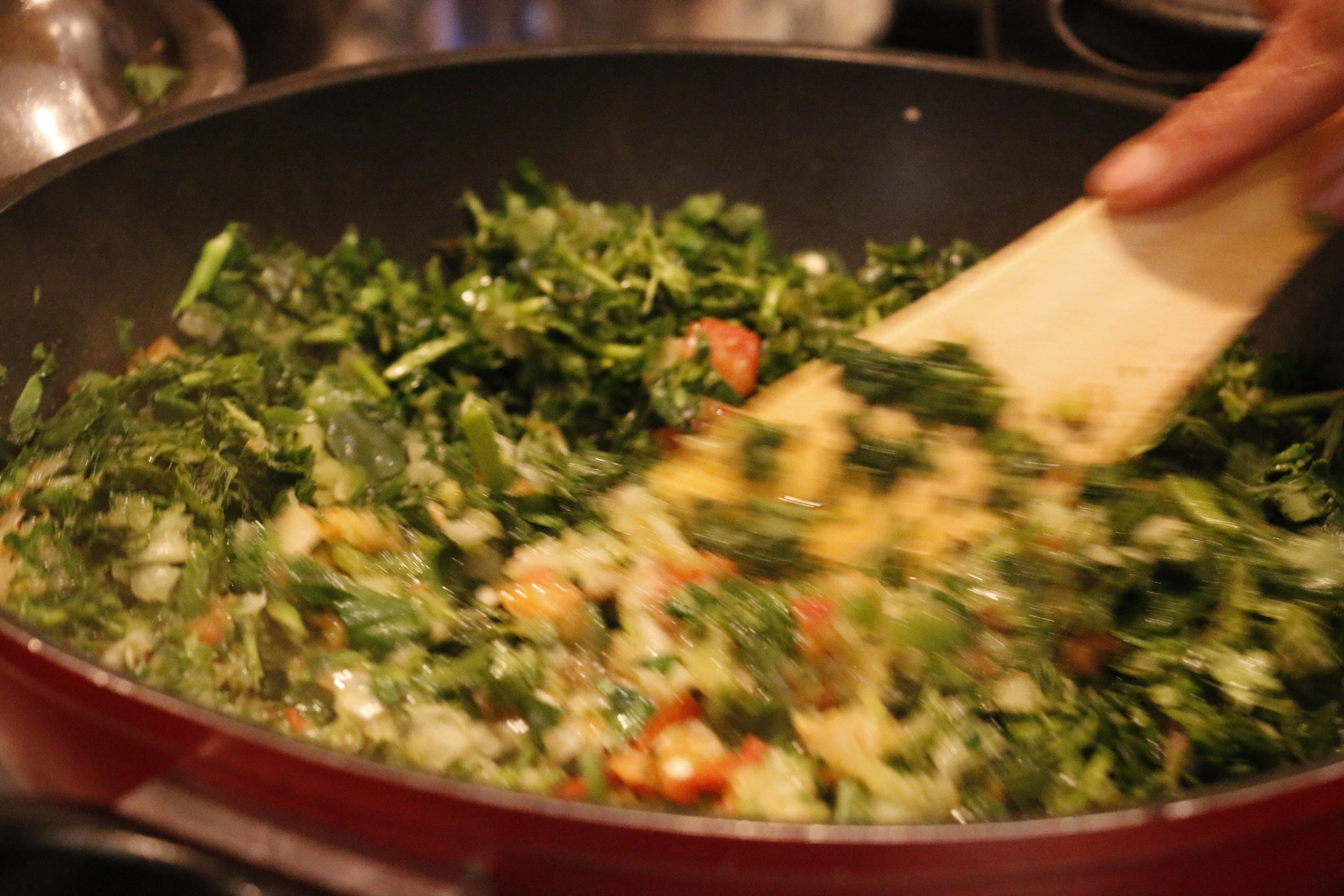 On the other pan where you have just done the seasoning, add finely chopped onions, tomatoes, green peppers/capsicum and green chillies. Saute this for five minutes. Then throw in cleaned and washed coriander,mint and Methi leaves. Add Salt and few spoons of red chilli powder and turmeric powder. Give a good mix.