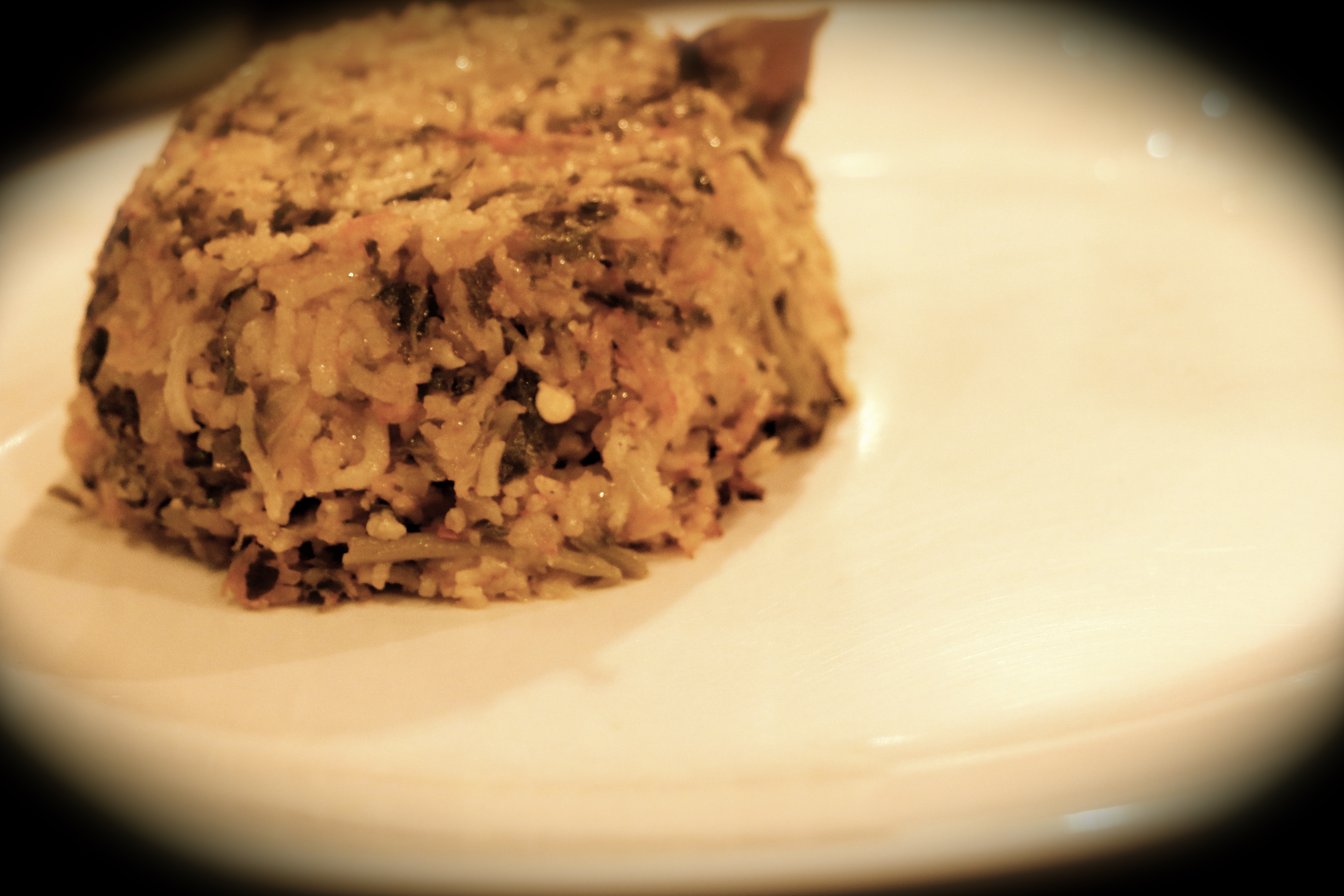 Ingredients round-up : To Season– OIl/Ghee, Cumin seeds,Bay leaves, Cinnamon sticks and cloves, pinch of hing/asafoetida Main Ingredients – Basmati Rice (At least 2 Cups for two people), Water(3.5 cups),Green chillies(according to your level of spice) One big onion, Tomatoes, One green pepper, handful of coriander and mint leaves, a whole bunch of Methi leaves. Other Spices– Red chilli powder, Turmeric powder, Salt to taste This rice can be served with plain yoghurt or any simple raita of your choice.