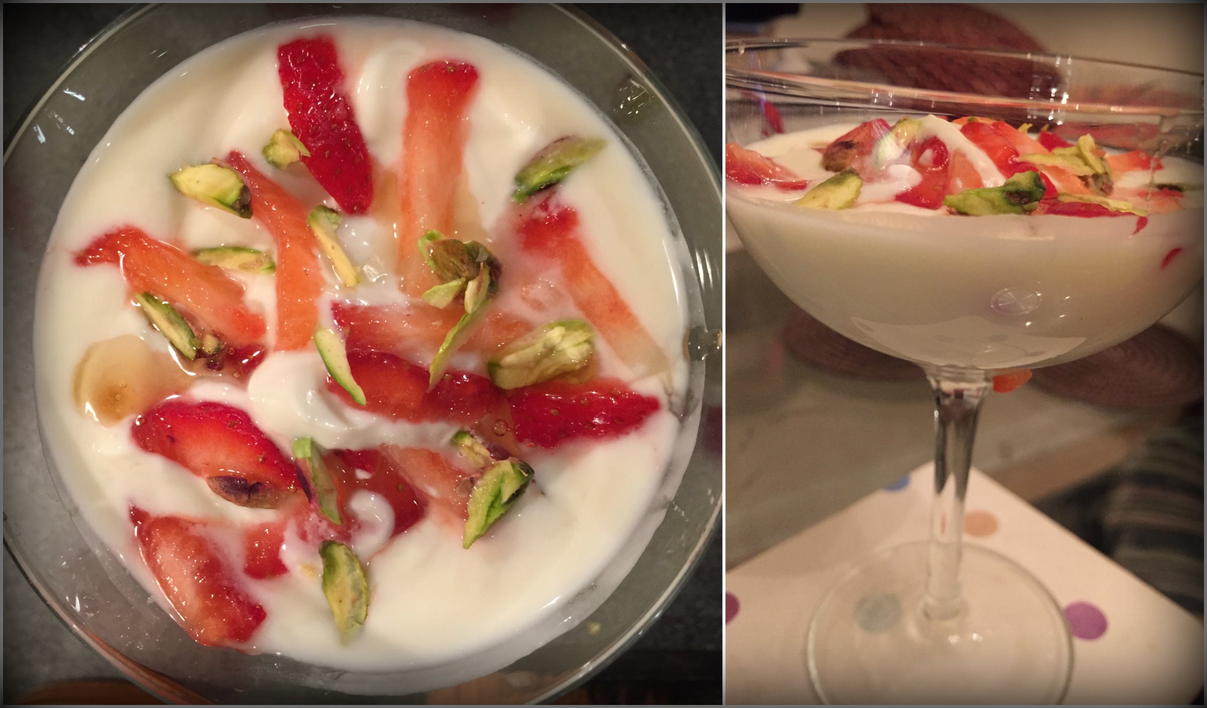 As we kiss goodbye to summer and also to finish off the last few berries from the fridge, I decided to whip up a quick dessert for us over the last weekend. Before getting onto the recipe, I have to tell you where the inspiration came from. On our recent holiday in Dubai, we indulged quite a bit. Isn’t that the law anyway? Extra food, extra cuddles, extra sleep and everything a bit too much on a holiday. So, one of the days we ordered for a luscious dessert with greek yoghurt, honey, figs and nuts. That sure sounded hopelessly exotic when I first read it on the menu. But when I actually tasted it, it was so simple that I could see all my senses working in perfect harmony to guess each ingredient that went into it. It was basically a huge serving on greek yoghurt flavoured with honey and topped with grilled figs and pistachios. And needless to say, it was one scrumptious thing. Ever since, I have been trying to make that at home. As I didn’t plan ahead, I thought I will just use the berries as topping for our recipe. It was obviously different from what we had in Dubai, but It sure did remind me of the good times from our holiday.