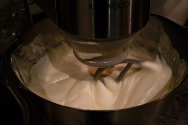 Whip the egg whites with a pinch of salt, add the sugar (the remaining half), with a wooden spoon, add them gradually and gently into the mixture of mascarpone and egg yolks, so you now have the cream for the tiramisu.